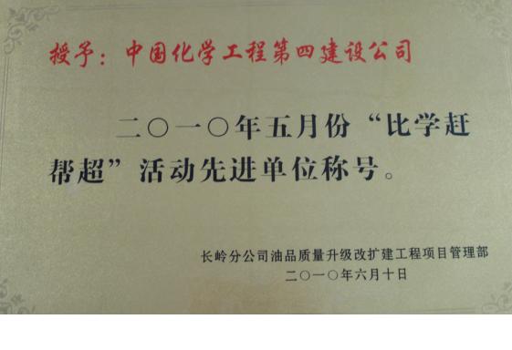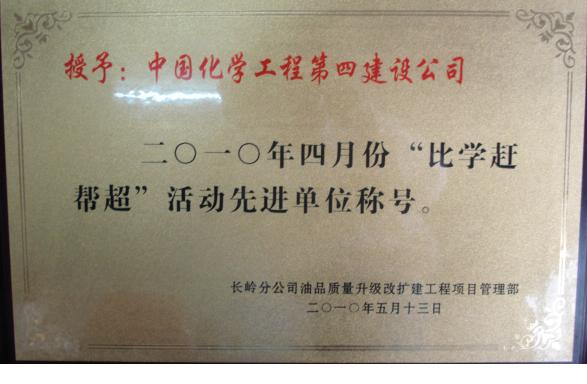 在隨后的“4.30”控制點和“5.20”控制點施工中,項目部精心組織施工、日夜奮戰、齊心協力,順利完成了這兩個控制點,贏得業主和監理的一致贊揚,在長煉樹立起四化建這面旗幟。在2010年4月,業主組織開展的“比學趕幫超”活動中,項目部從20多家參建單位中脫穎而出,榮獲了“文明工區獎”、“比學趕幫超活動先進單位”、“質量樣板”、“HSE先進工地”四個獎項。在2010年5月,項目部又再次榮獲“比學趕幫超”活動先進單位。在施工中,先后有付承、張治冬、丁振華、周葵花、肖小健和劉立新獲得業主授予的“優秀焊工”獎,朱文捷、李衛紅兩人獲業主授予的“HSE”先進個人。