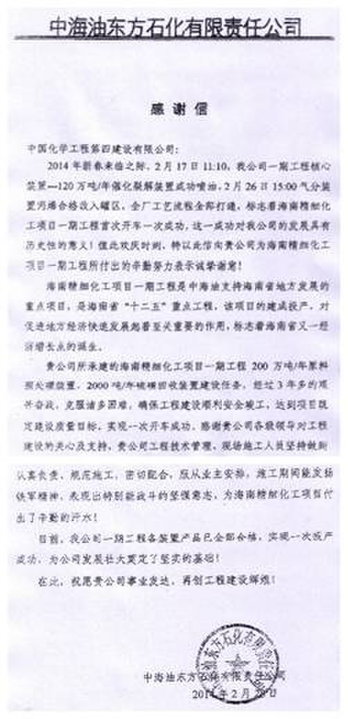 自2010年8月11日開(kāi)工以來(lái),項(xiàng)目部在分公司經(jīng)理陳文彬、項(xiàng)目經(jīng)理劉興陽(yáng)的領(lǐng)導(dǎo)下,艱苦奮戰(zhàn)、精心組織、精細(xì)管理,工程整體形象良好、工程建設(shè)程序規(guī)范、質(zhì)量控制到位,于2013年9月28日按期順利實(shí)現(xiàn)機(jī)械竣工。通過(guò)投料試車(chē),該項(xiàng)目達(dá)到一次試車(chē)成功、生產(chǎn)出合格產(chǎn)品的良好效果,受到了中海油東方石化有限責(zé)任公司的來(lái)信稱(chēng)贊。