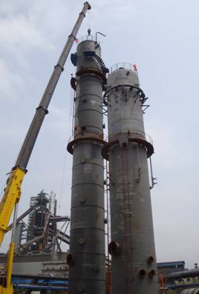 4月12日早上7點(diǎn),項(xiàng)目部管理人員到達(dá)現(xiàn)場開始準(zhǔn)備。7點(diǎn)30分,200噸吊車進(jìn)入現(xiàn)場,韶鋼項(xiàng)目經(jīng)理王建民來到現(xiàn)場進(jìn)行指揮。首先吊裝的是高27米、重18.5噸的脫苯塔。上午9點(diǎn)整,脫苯塔順利安裝完成。吊車開始移位,準(zhǔn)備吊裝高12米(總高31米)、重18噸的終冷塔上節(jié)。上午11點(diǎn),終冷塔上節(jié)開始組對焊接。1個(gè)多小時(shí)后,吊車順利脫鉤,終冷塔順利安裝完成。