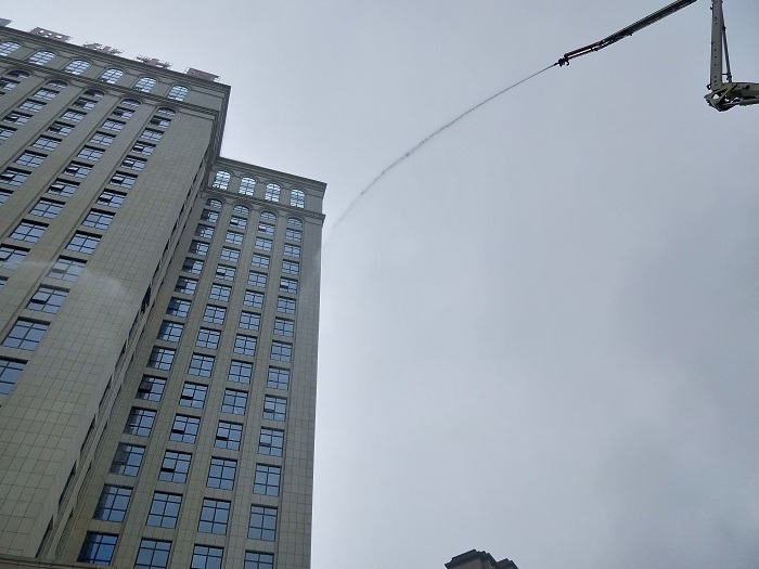 6月22日上午930分,四化大廈9樓濃煙滾滾,樓內警鈴大作,員工們手拿濕毛巾,捂住口鼻從樓內消防通道快速有序的撒離疏散到安全地帶,工作人員不時提醒疏散人員清點人數,報告傷亡情況和穩定情緒。不到兩分鐘時間,兩臺消防車風馳電掣的駛入大廈院內,全副武裝的消防隊員快速啟動消防裝備,分兩路進行救援和滅火。不一會兒,樓內滅火隊員和消防云梯車幾乎同時噴出水柱直達20樓頂。