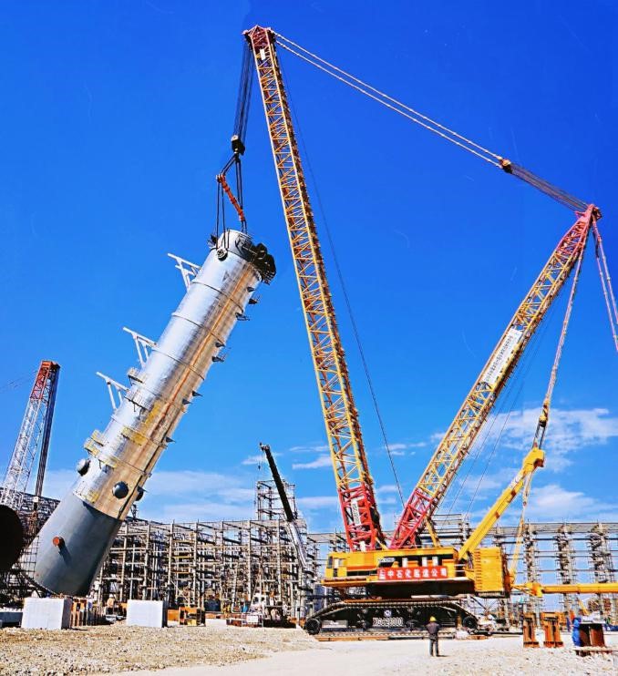 自今年9月20日以來(lái), 苯乙烯項(xiàng)目部共成功吊裝第一脫氫換熱器、三聯(lián)換熱器、轉(zhuǎn)烷基化反應(yīng)器、苯處理器、多乙苯塔、苯/甲苯塔等大型設(shè)備13臺(tái),吊裝總噸位約達(dá)2000噸。其中,最重設(shè)備三聯(lián)換熱器重687噸,高41米,最大吊裝高度63米;而這次吊裝的低壓粗苯乙烯塔,塔體總高度92.2米,重量950噸,是整個(gè)大型設(shè)備吊裝中最復(fù)雜的設(shè)備之一,分兩段運(yùn)至施工現(xiàn)場(chǎng),由2000噸吊車吊起來(lái)空中組對(duì)、焊接。