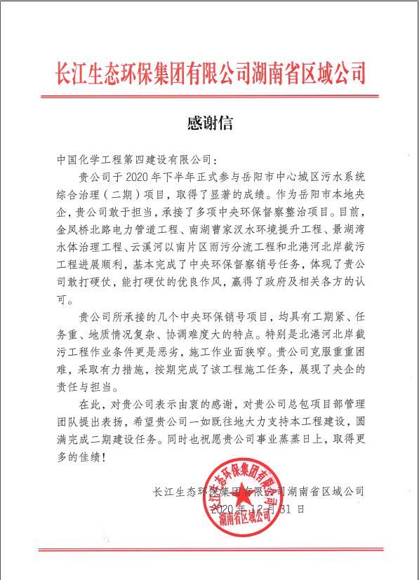 1月1日,新年的第一天,公司岳陽中心城區(qū)污水項目部收到長江生態(tài)環(huán)保集團(tuán)有限公司(湖南省區(qū)域公司)送來的感謝信。在信中,業(yè)主對公司岳陽污水項目部管理團(tuán)隊提出表揚,對工程建設(shè)過程中面對工期緊、任務(wù)重、地質(zhì)情況復(fù)雜、協(xié)調(diào)難度大等諸多困難,特別對建筑片區(qū)施工的北港河北岸截污工程克服重重困難、采取有力措施按期完成工程施工任務(wù)表示肯定,稱贊公司敢于擔(dān)當(dāng)、能打硬仗,展現(xiàn)了央企的責(zé)任與擔(dān)當(dāng)!業(yè)主對公司各級領(lǐng)導(dǎo)表示衷心的感謝和誠摯的節(jié)日問候,希望公司一如既往地支持工程建設(shè),圓滿完成岳陽市中心城區(qū)污水二期建設(shè)任務(wù)。