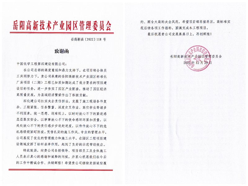近日,市政工程公司收到岳陽(yáng)高新技術(shù)產(chǎn)業(yè)園區(qū)管理委員會(huì)發(fā)來(lái)的《致謝函》,高度贊揚(yáng)市政公司在承建的岳陽(yáng)高新技術(shù)產(chǎn)業(yè)園區(qū)標(biāo)準(zhǔn)化廠房項(xiàng)目(二期)工程建設(shè)過(guò)程中展現(xiàn)出來(lái)的精誠(chéng)合作、頑強(qiáng)拼搏的施工風(fēng)范,并感謝市政公司對(duì)于園區(qū)產(chǎn)業(yè)配套升級(jí)和經(jīng)濟(jì)高質(zhì)量發(fā)展所做出的努力和貢獻(xiàn)。
