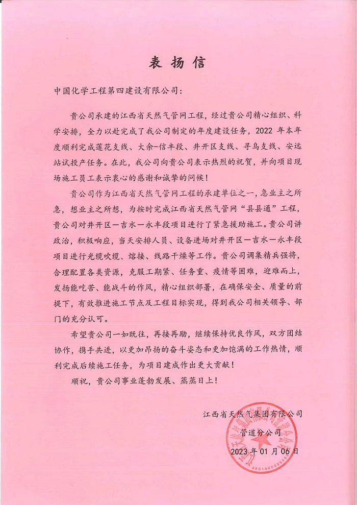 元月7日,江西省天然氣集團(tuán)有限公司管道分公司給華北公司發(fā)來(lái)表?yè)P(yáng)信,對(duì)華北公司安全優(yōu)質(zhì)高效完成江西省天然氣管網(wǎng)工程年度建設(shè)任務(wù)表示感謝。