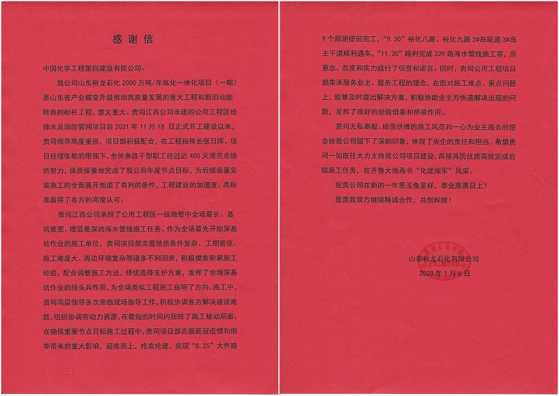 新年伊始,江西公司收到山東裕龍石化有限公司的《感謝信》,感謝江西公司在承建的山東裕龍石化公用工程區(qū)給排水及消防管網(wǎng)項(xiàng)目中,保質(zhì)保量完成了業(yè)主的年度節(jié)點(diǎn)目標(biāo),為后續(xù)裝置安裝施工的全面展開(kāi)創(chuàng)造了有利的條件,工程建設(shè)的加速度、高標(biāo)準(zhǔn)贏得了各方的高度認(rèn)可,公司無(wú)私奉獻(xiàn)、頑強(qiáng)拼搏的施工風(fēng)范和一心為業(yè)主服務(wù)的理念,體現(xiàn)了央企的責(zé)任和擔(dān)當(dāng)。