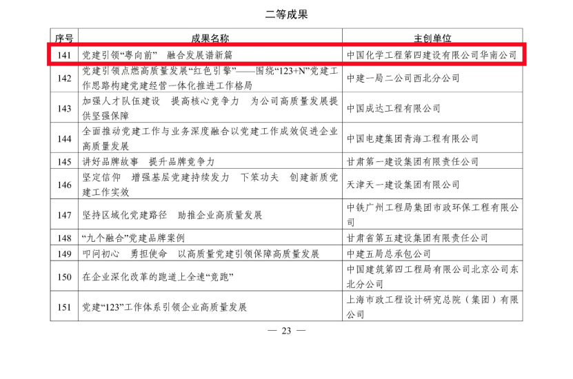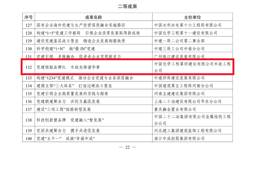 5月27日,從中國施工企業管理協會傳來喜訊,公司選送的黨建案例《黨建引領價值創造  繪就“雙百億”發展新畫卷》獲評2024年工程建設企業黨建工作一等成果,市政工程公司選送的黨建案例《黨建領航品牌紅  市政先鋒譜華章》和華南公司選送的黨建案例《黨建引領“粵向前” 融合發展譜新篇》獲評二等成果。