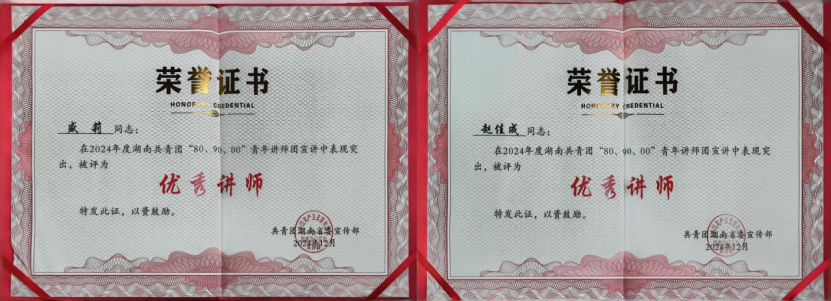 近日,共青團湖南省委召開“理 XIANG 青年”新時代湖湘青年理論學(xué)習(xí)年度示范宣講會。會上,公司青年盛莉、趙佳成榮獲“湖南省2024年度優(yōu)秀講師”稱號。