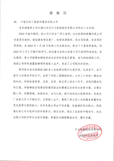 近日,華南公司從化萬力輪胎三期項目團隊收到萬力輪胎股份有限公司發(fā)來的感謝信。信中高度贊揚公司項目團隊在2025年春節(jié)期間高效完成全廠停工大檢修任務(wù),以專業(yè)能力和責(zé)任擔(dān)當(dāng)助力業(yè)主實現(xiàn)“開門穩(wěn)、開門紅”。