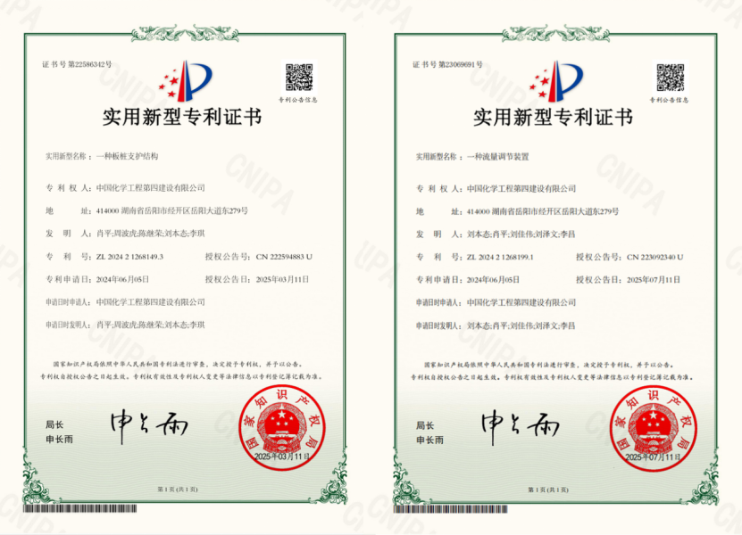 近日,西部公司技術創新喜結碩果,自主研發的“一種板樁支護結構”“一種流量調節裝置”兩項技術分別獲國家知識產權局實用新型專利授權。