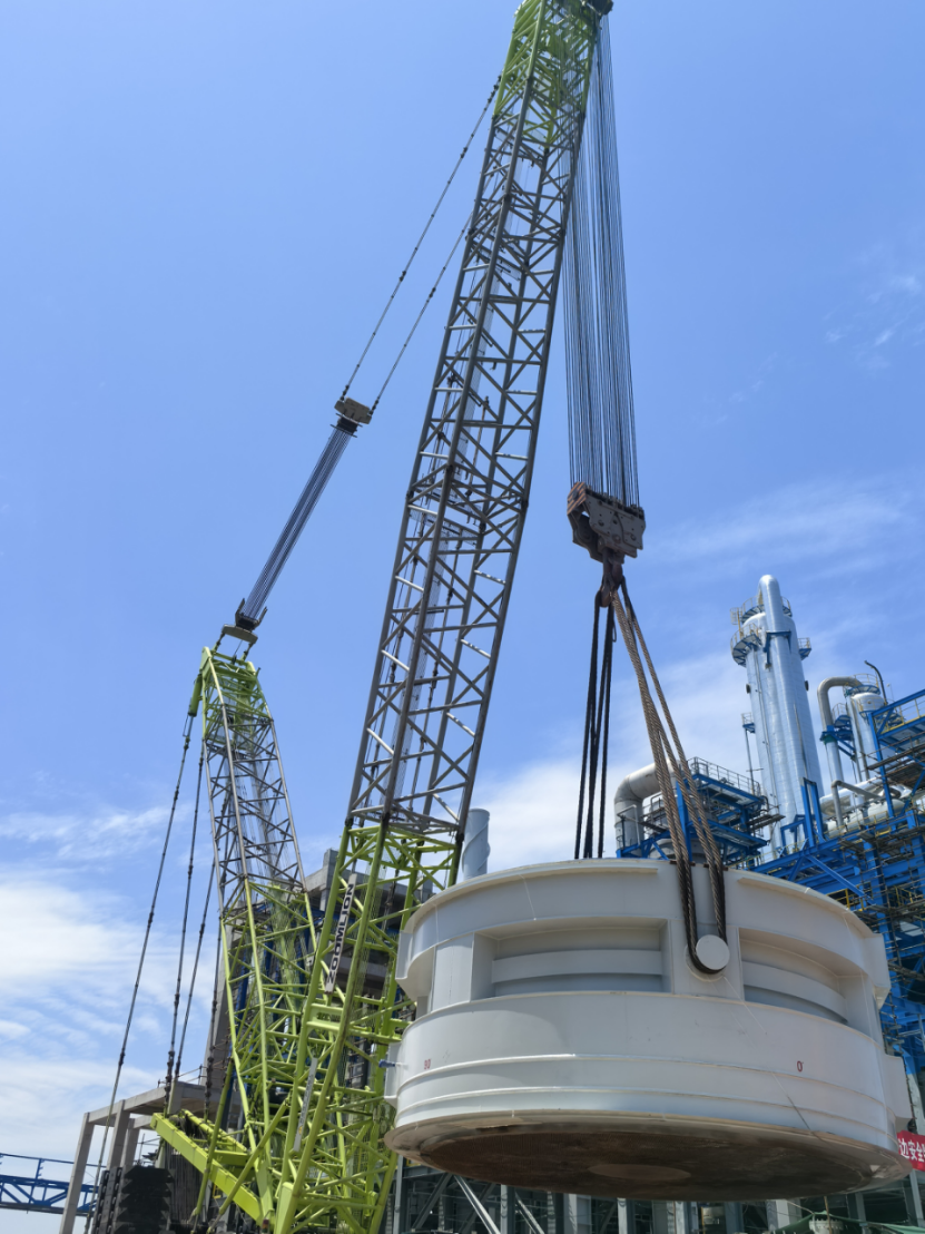 這兩臺(tái)設(shè)備中的4R101氧化反應(yīng)器直徑9.1米、高4.4米、中間段凈重410噸, 4R102氧化第二反應(yīng)器凈重390余噸。面對(duì)設(shè)備體積龐大、現(xiàn)場(chǎng)作業(yè)空間受限及風(fēng)力不穩(wěn)定等難題,項(xiàng)目團(tuán)隊(duì)采用單機(jī)抬吊工藝,主吊選用650噸履帶吊搭配310噸超起配重,制定詳細(xì)預(yù)案進(jìn)行模擬演練。吊裝過程中,技術(shù)人員全程監(jiān)測(cè)風(fēng)速、設(shè)備姿態(tài)及受力數(shù)據(jù),歷時(shí)兩天將這兩臺(tái)巨型設(shè)備毫米級(jí)精準(zhǔn)吊裝就位,受到業(yè)主的一致好評(píng)。